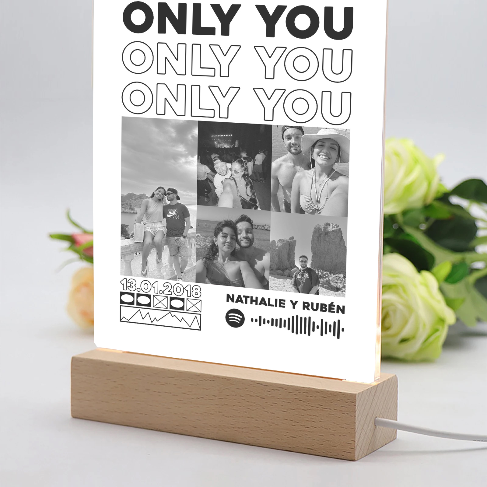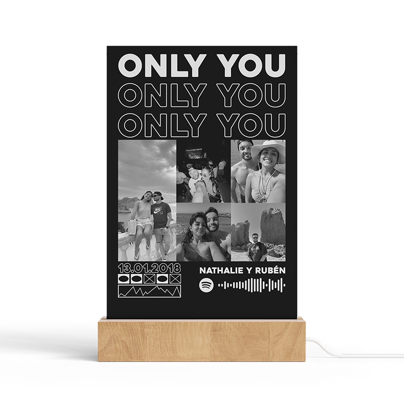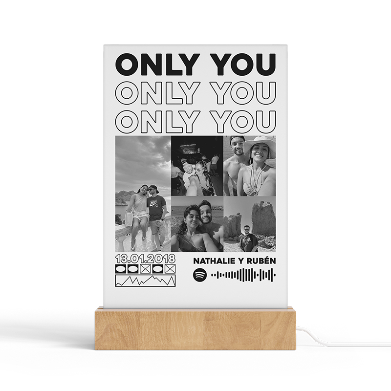La Lámpara ONLY YOU es el regalo perfecto para iluminar momentos especiales. Esta lámpara es un collage único de tus imágenes favoritas, acompañado de la canción que más te gusta, todo diseñado a mano por nuestros talentosos diseñadores profesionales. Es una combinación perfecta de tecnología, arte y tus recuerdos más preciados.