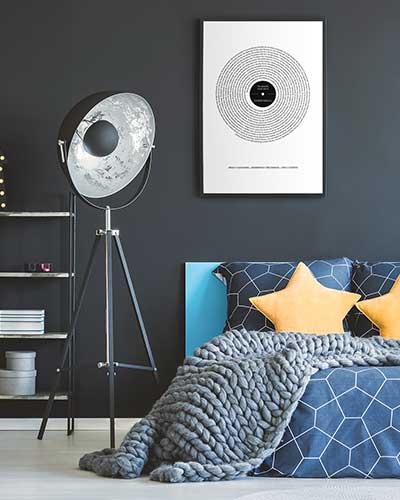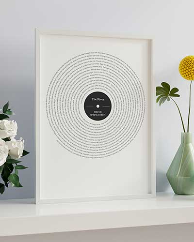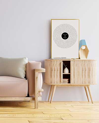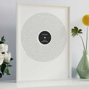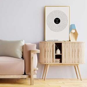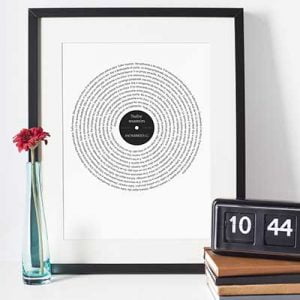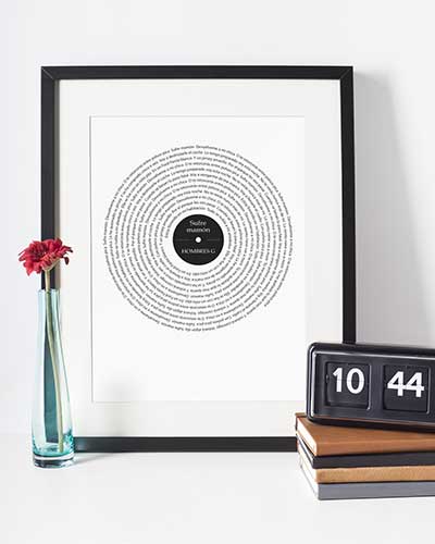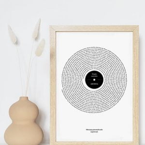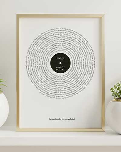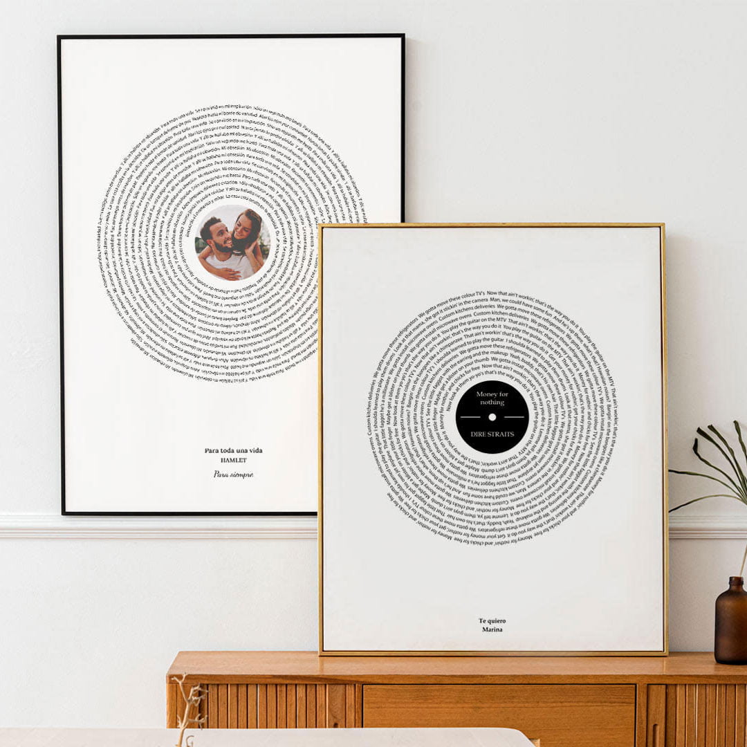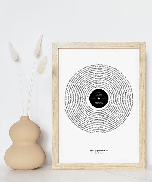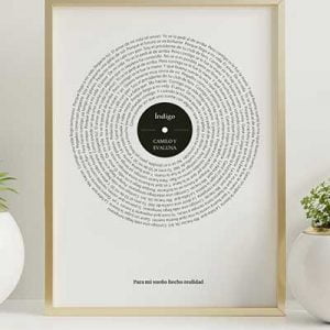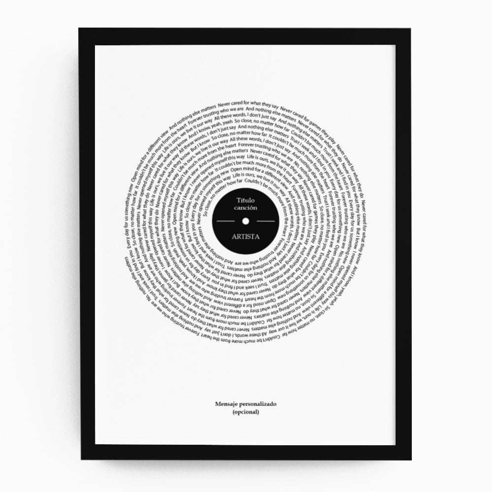 Espectacular cuadro con la letra de tu canción favorita. Lo último en Cuadros de Música. La letra recorre el cuadro en forma de espiral simulando un disco de vinilo. Tu eliges la canción que desees y nosotros nos encargamos de hacer un cuadro con la BSO de tu vida. Disponible en distintos tamaños y formatos. 100% Personalizable.